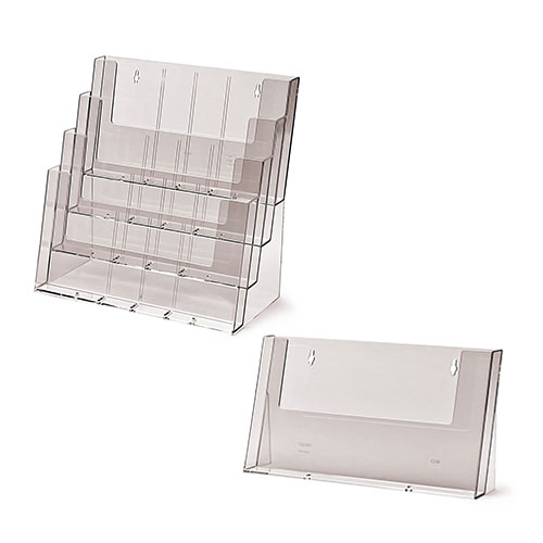 4 x A4 ali 8 x 1/3A4 - priloženi razdelilniki, globina žepa je 32mm. Dimenzije stojala 236 x 340 x 175mm. Možnost namestitve tudi na steno.