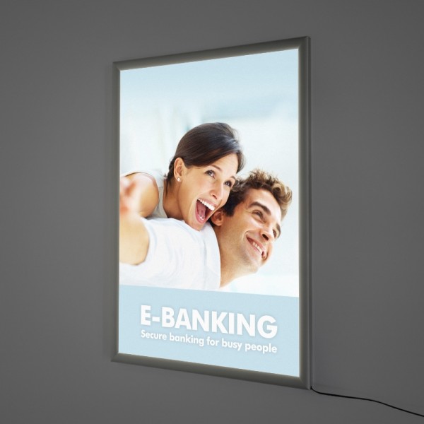 Zelo eleganten in tanek izgled. Hitra in enostavna menjava plakatov skozi zadnjo stran, kjer se nahaja zaščitna folija z magnetnim trakom na robovih.